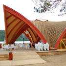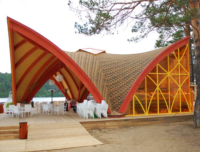 Задача покрытия стен внутри помещения состояла в том, чтобы подчеркнув природную естественность дерева, сохранить ее экологичность, а также защитить древесину от негативного влияния погодных явлений. Конструкция кафе имеет изогнутые элементы на фасаде, что могло осложнить процесс обработки древесины. Универсальным решением столь сложной задачи стала водорастворимая лазурь Lignovit Lasur. Продукт отличается не только тем, что обладает отличными декоративными свойствами, защищает от УФ-излучения, плесневых грибков и синевы, но и удивительно легко наносится, даже на сложные поверхности: без подтеков, капель и «разводов».