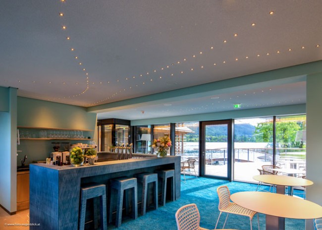 Любимая часть здания - это бар, который был выполнен по технологии "ADLER Used-Look" (эффект состаривания), специальный художественный эффект: "Мы вложили много энергии в дизайн бара. Интерьер мы сделали из клена, - древесины твёрдой породы, потому что его легко обработать и он имеет очень мелкие поры. По проекту архитектора, желаемый цвет был бирюзовым. Адлер помог нам с этим. Чтобы создать уникальную поверхность, несколько сотрудников испробовали разнообразные и невероятные методы. В результате усердной работы был создан изысканный "эффект старения", следовательно, было что-то уникальное", говорит Микаэла Генсер. Система покрытия состоит из окраски бейцем (морилкой) ADLER Aqua-Neoantik, лаком Ventopur ADLER G10, бейцем ADLER Antikpatina который подчеркивает структуру древесины. Верхний слой был обработан ADLER PUR-Naturmatt - это бесцветный лак с эффектом непокрытой ничем древесины, которая особенно приятная на ощупь.