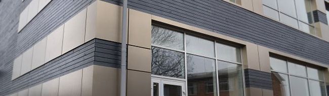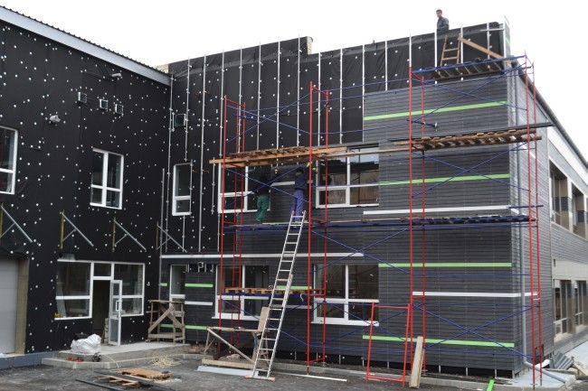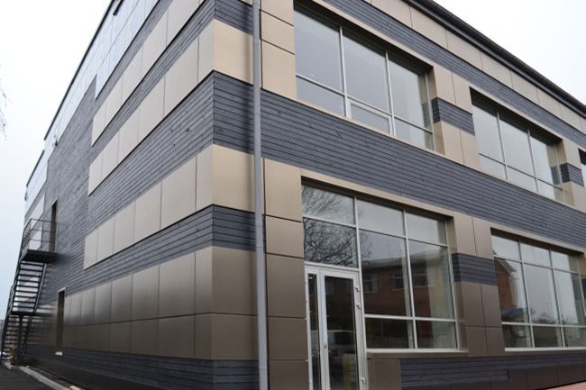 В Житомире построен торгово-офисный центр с энергосберегающим ультра - современным фасадом. Вентилируемый навесной фасад выполнен из алюминиевых композитных панелей в сочетании с деревом. Строгий алюминий в комплексе с фактурной древесиной смотрится подчеркнуто изысканно.