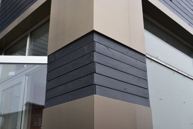 Чтобы подчеркнуть природную красоту фактуры древесины, было использовано покрытие, создающее жемчужный перламутровый эффект Adler Lignovit Platin. В сочетании с грунтом Lignovit IG, лазурь защищает древесину от воды, синевы, грибка, насекомых и особенно от солнца. Строгий алюминий и живая древесина дополняя друг друга создают оптический контраст, который мы повсеместно встречаем в природе. Именно поэтому сегодня так много объектов в Европе выполнено в такой технике. Также как алюминиевые панели, деревянные ламели, покрытые Lignovit Platin под светом солнечных лучей меняют свой оттенок в зависимости от освещения, что придает фасаду неповторимый изысканный шарм.