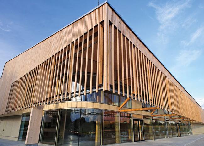 Массивная конструкция крыши охватывает 20-метровое широкое закрытое пространство, чтобы сохранить объединяющую форму стропил для всех помещений центра.