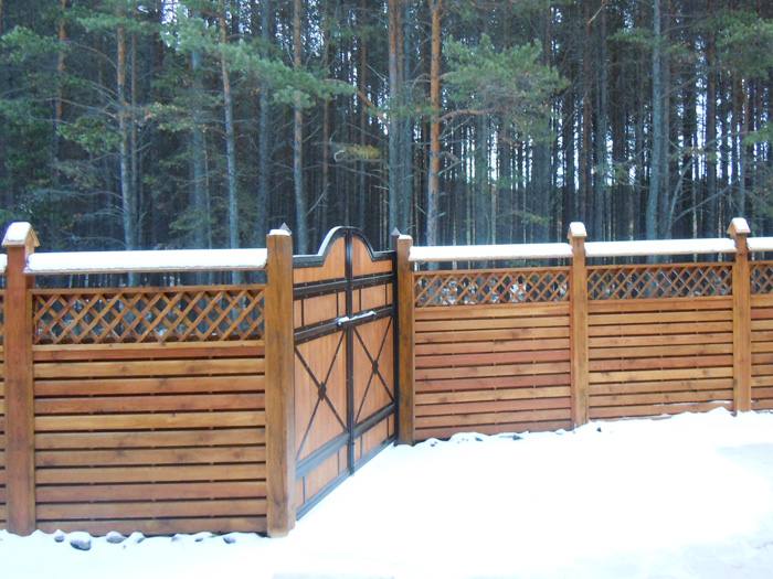 Забор вокруг дома покрыли в основной тон дома, используя для этого те же материалы.