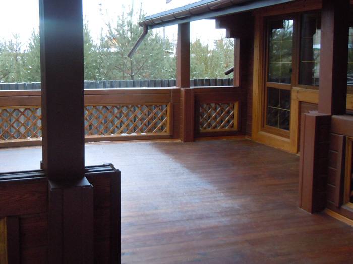 Для покрытия пола и лестниц, снаружи дома, использовали масло Pullex Bodenöl, цвет 50528 Kongo. Для этого покрытия не требуется дополнительная защита от синевы и плесени. Кроме того, покрытие обладает противоскользящими свойствами, что не мало важно для семьи, в которой есть дети. Глубоко проникая в древесину, масло придает поверхности водоотталкивающие свойства. При этом поры дерева остаются открытыми. Такие свойства продукта защитят деревянные настилы от поглощения лишней влаги, набухания, пересыхания и растрескивания.