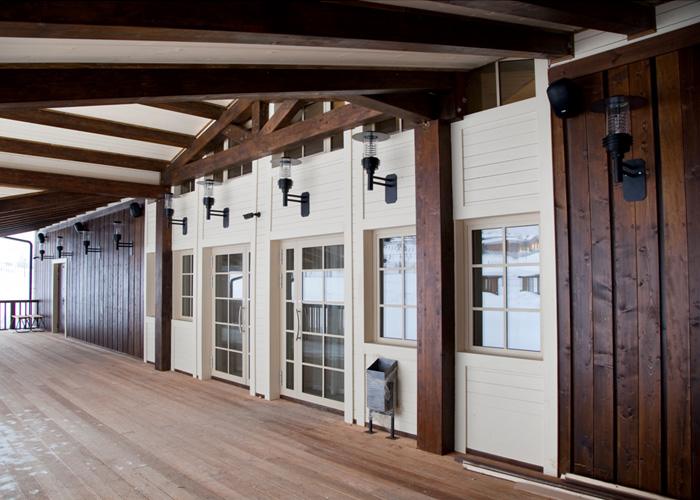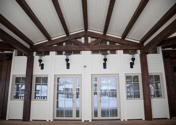 Для защиты натурального материала фасада и сохранения его внешнего облика были применены грунтовочные и лессирующие покрытия на водной основе Lignovit, которые поставила компания "Экодом", официальный представитель компании "Хольцшутц МСК" в городе Ижевск. Эти специализированные составы применяются в том числе и в Альпийских горах при строительстве из древесины.