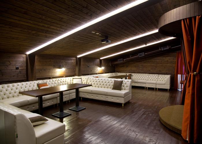 Загородный характер заведения продиктовал концепцию архитектурного проекта – стилизованное шале. Компактное здание, гармонично вписавшееся в окружающую панораму, на самом деле представляет собой большое двухэтажное строение с открытыми верандами. Из залов предусмотрены удобные выходы на уютные площадки с беседками, зелеными лужайками, теннисными уголками.