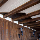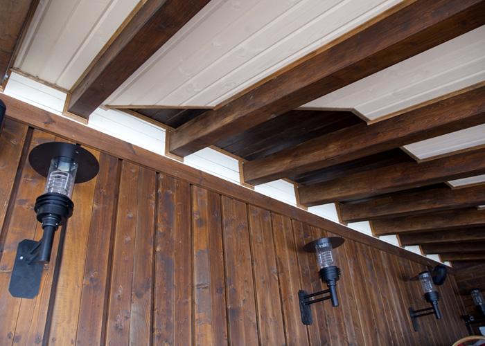 В качестве финишного покрытия для декоративных балок, входных дверей, стен и потолков внутри помещения, а так же фасада выбрали декоративную тонкослойную лазурь на водной основе Lignovit Lasur, цвет LW 02/4 Palisander. Лазурь обладает высокой атмосферостойкостью, защищает поверхность от влаги, но обладает хорошей паропроницаемостью. Приятная матовая поверхность мягко маскирует мелкие дефекты древесины, выгодно подчеркивая рисунок дерева. На долгое время остается эластичной, с течением времени не отслаивается и не шелушится.