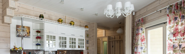 В небольшой кухне-столовой все функционально, комфортно и изящно. Холодные оттенки белого камина и потолка (ADLER Lignovit Color оттенок RAL 9016) эффектно сочетаются с теплым оттенком лазури Woodwax оттенка LW 12/1 Margerite.