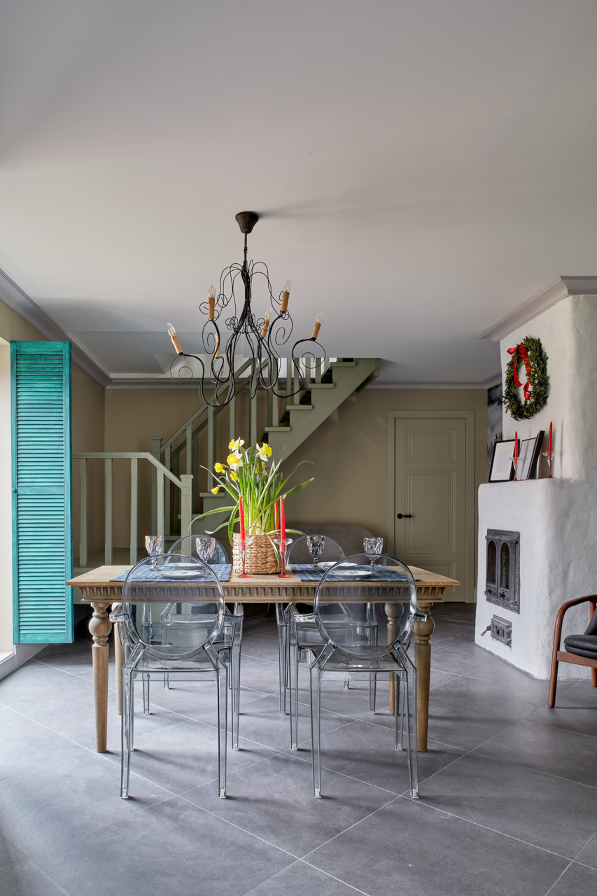 Для придания цвета была использована кроющая краска Adler Lignovit Color STQ на водной основе. Она обладает отличной укрывистостью и прочным сцеплением с окрашиваемой поверхностью. Краска без запаха, с ней легко и просто работать внутри помещения. Можно наносить вручную или распылением.