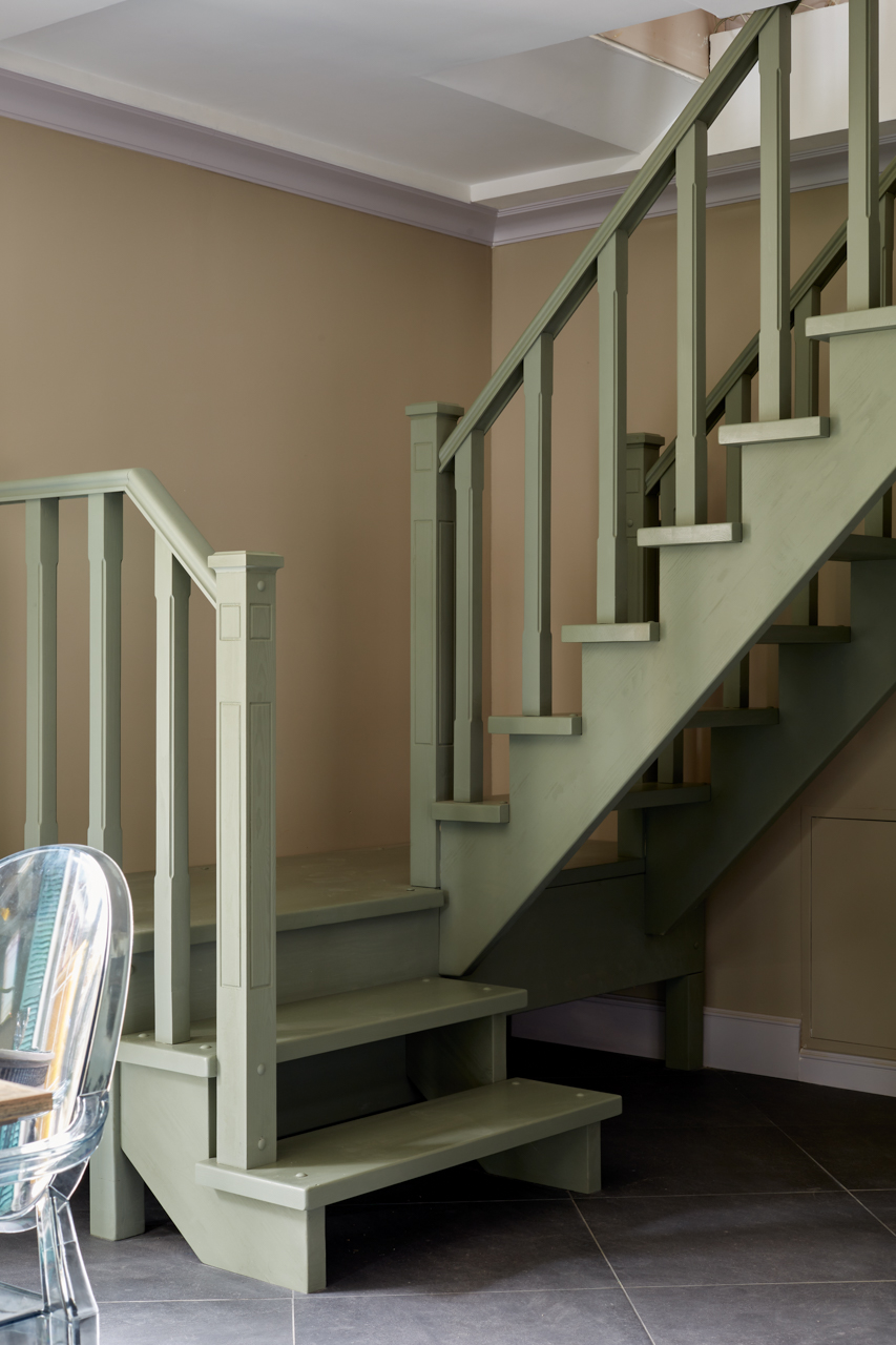 Перед началом работ лестницу демонтировали, отшлифовали и по-детально покрасили в нужный цвет RAL7033 Zementgrau. На подступенки лестницы и перила дополнительно нанесли износостойкий лак Adler. После покраски лестницу смонтировали и установили на прежнее место.