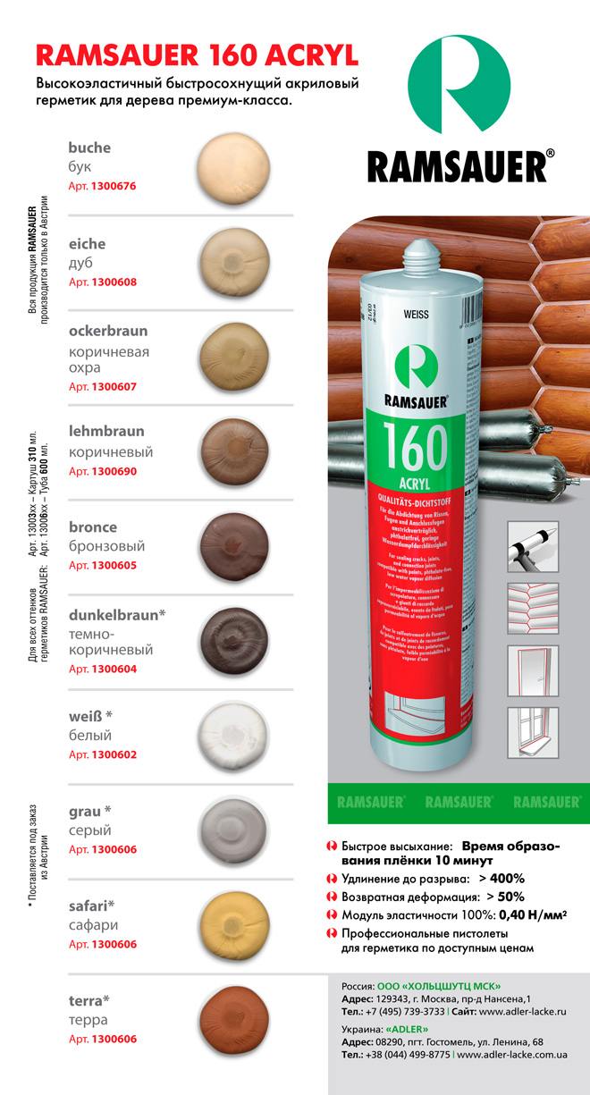 RAMSAUER 160 ACRYL- служит для герметизации и заполнения стабильных швов и трещин. А так же швов, подверженных нагрузкам растяжения (например, швы между бревнами, брусом, примыкания к дверным коробкам, стыковые швы между деревянным окном и кладкой, штукатуркой, бетоном, природным камнем, стыки с бетоном и цементными строительными элементами). Герметик так же применяется для герметизации окон и дверных коробок, фасадов из бетона с открытым наполнителем, готовых элементов из газобетона, а также для приклеивания полистирола. Отлично подходит для внутренних и наружных работ.